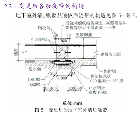 根据设计单位给出的图纸,原设计中地下室外墙后浇带的做法见图2,地下室底板后浇带的做法见图3,地下室顶板后浇带的做法见图4。